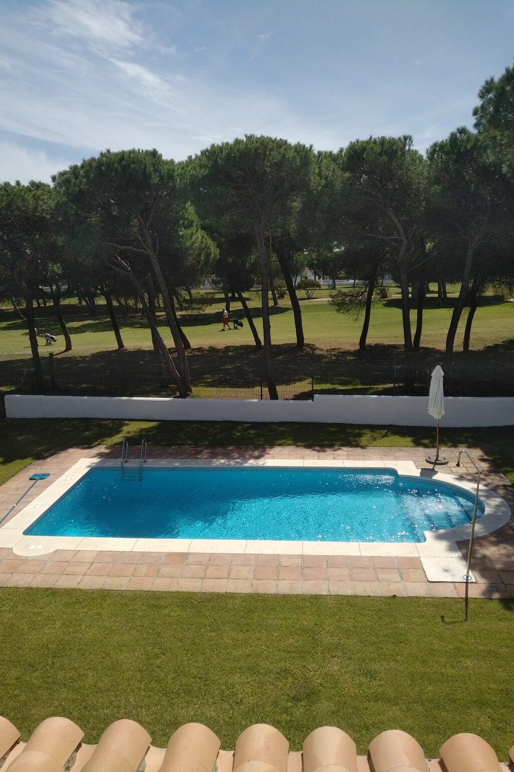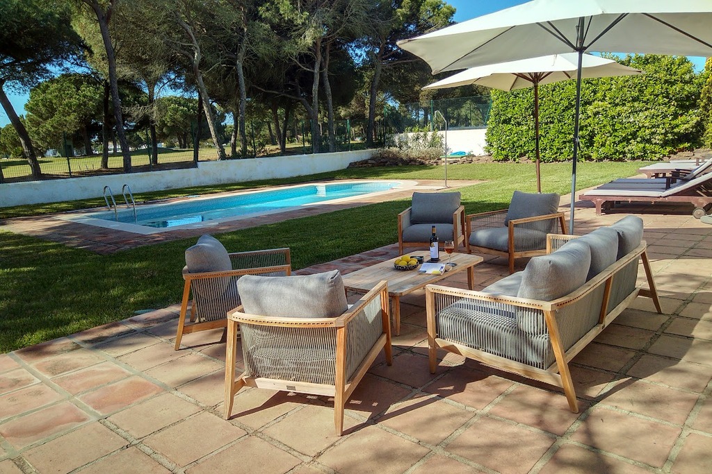 The south facing year patio overlooking the pool and fairway provides an area to relax with outside seating and sun loungers.